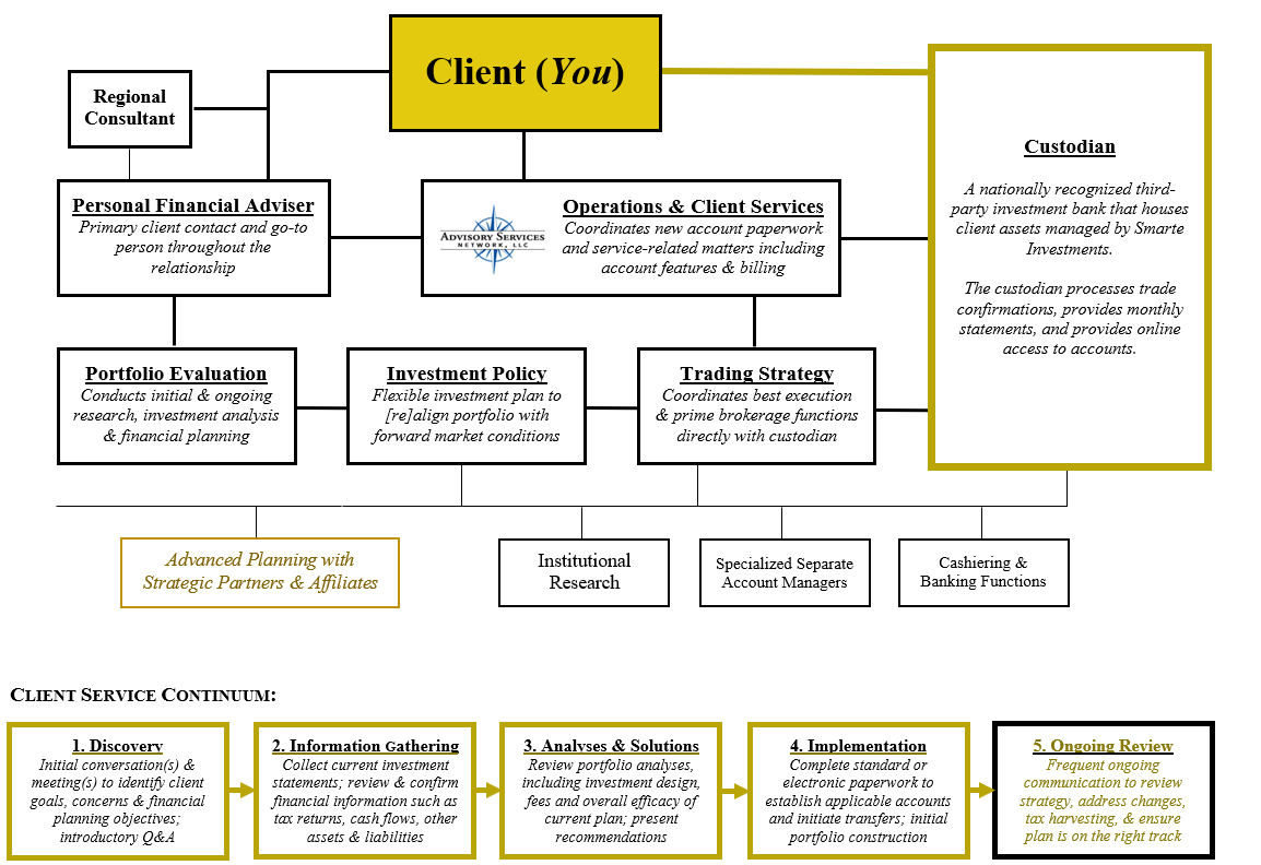 Our client service structure is based on an institutional archetype with specialized divisions of labor and the safeguarding of client assets through independent third-party custodians. Every client has a dedicated personal financial adviser as their primary “go-to” person throughout the relationship. In addition to periodic reviews, we broach ongoing issues of relevance to clients, such as retirement planning, cash flow management, distribution ordering, tax harvesting, education funding and wealth transfer strategies.